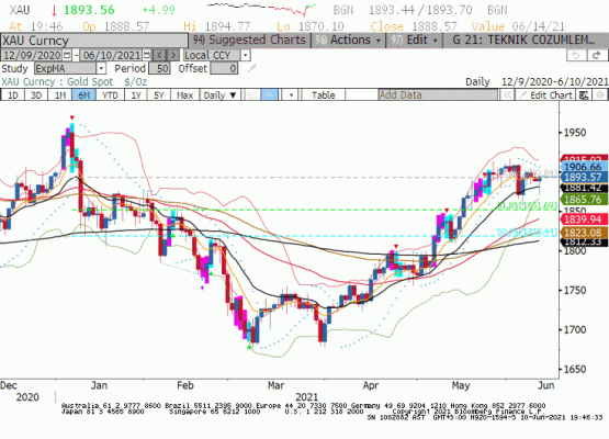 Ons Altın Perşembe gününü %0.38 artış ile +6.85 puan ile 1896 dolaylarında kapatırken beklentileri bir hayli aşan ABD enflasyon verisini ve ABD 10 yıllık tahvil faizlerinde gerçekleşen %3.60 ‘lık düşüşü yeterince güçlü fiyatlayamamış görünüyor. Önümüzdeki süreçte yükselişin devam edeceği beklentilerinin yanında 1900 doların üzerindeki kapanışlarla birlikte yönünü ilk etapta 1920 ve daha sonrasın 1950 seviyelerini test ederek 2020 yazındaki seviyeleri olan 2000 dolarları tekrar test edebilir. Fakat bunun önündeki en büyük engel global ekonomilerdeki toplanmanın ve büyümenin devam etmesi. Şu sıralar pandemi etkilerinin azalması ve aşılamanın dünya çapında hızlanması ekonomiler için bir katalizör görevi görüyor.