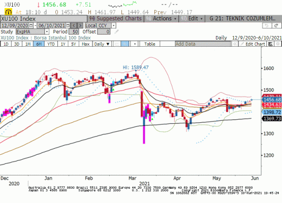 Perşembe gününü , yüzde 0,52 değer kazanarak günü 1.456,68 puandan tamamlayan BIST 100 endeksinde yatay hareket hala son bulmuş görünmüyor . Önümüzdeki günlerde 100 günlük hareketli ortalamanın bulunduğu 1470 seviyelerini test edebilir. Nisanın sonlarından itibaren yeni bir yükseliş trendi oluşturmaya çalışan endeks için en kritik seviye ilk etapta 1470 seviyeleri. Bununla birlikte son aylarda kura çok duyarlı hale gelen endeks dünkü düşüşten aynı oranda verim alamadı ve alımlar sınırlı kaldı. Önümüzdeki süreçte Biden’ın Türkiye ziyareti ve bunun üzerine söylemleri endeksin yönünü tayin edecek.