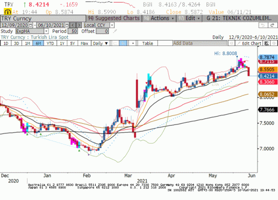 Dolar/TL Perşembe gününü 8,42730 ile %1.78 düşüşle günü tamamladı. ABD enflasyon verisiyle hızlanan düşüşle birlikte kritik seviyeler olan 21 günlük üssel hareketli ortalamanın altında bir kapanış gerçekleştirdi. Görünüm olarak yükseliş trendi bozulmamış görünse de bu düşüş son 2 ayın en sert düşüş oldu. Bununla birlikte ABD Başkanı Joe Biden’ın gerçekleştireceği Türkiye ziyaretinden olumlu haber akışının gelmesi halinde düşüş hız kazanabilir ve dolar/tl ilk etapta 8.20 seviylerini ve daha sonrasında 8.00 psikolojik seviyelerini test edebilir.