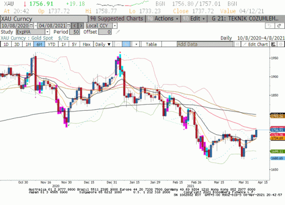 Sene başından bu yana ekonomik ısınma ve enflasyon beklentisi ile küresel tahvil faiz oranlarında yükseliş altın fiyatlarını baskıladı. Geçtiğimi haftaya gelindiğinde tahvil getirilerinde yaşanan geri çekilmeden aldığı destek ile altının 1760 dolara doğru yükseliş eğilimine girdiğini gördük. Altın için bu hafta 1760 doların yukarı yönde kırılması pozitif olacaktır. Öte yanda bu hafta ABD başta olmak üzere açıklanacak olan Mart ayı enflasyon rakamları ve yine ABD’de yapılacak 10 yıllık tahvil ihalesi ile fiyatlama şekillenecek. Tahvil piyasası 10 yıllıklarda şimdilik %2 üzerinde fiyatlama için acele etmiyor. Bir taraftan da FED ve Powell’ın enflasyonda yükseliş kalıcı olmayacak söylemine inanmak istiyor. Ons altında 1760 üzerinde altın EFT’lerine olası girişin vereceği moral fiyatlamayı 1790 dolar seviyesine taşıyabilir. Kısa vadeli tepki alımlarının orta vadeli pozitif fiyatlamaya dönüşmesi büyük ölçüde bu harekete bağlı.