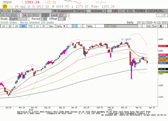 Geçtiğimiz hafta yüksek seviyesi 1445 olurken BIST100 iki kez denedi ancak bu seviyeyi geçecek güç bulamadı. Dışarıda ABD Doları değer kaybederken Mart ayında yükselen enflasyon ve 15 Nisan PPK kararı ile TL ve cinsi varlıklar pozitif fiyatlamaya geçmekte zorlanıyor. Nisan ayı toplantısında TCMB’nin politika faizini %19 seviyesinde koruyabilir. Bu durum bankacılık sektörünün esas faaliyet alanı olan krediler için olumsuz ve sektöre ilişkin olumsuz beklentileri beraberinde getiriyor. 2020 son çeyrekte bankacılık sektörünün endeksteki yükselişe katılması ileriye dönük enflasyonda iyileşme beklentisi ile gerçekleşti. Şimdilerde petrol fiyatları başta olmak üzere yükselen maliyet enflasyonu ve son dönem TL’nin değer kaybı ile beklentilerde bozulma yaşandı. 2020 yılında piyasayı yukarı taşıyan sınai sektörü de zayıflayınca BIST100 endeksi önemli gördüğümüz 1400 seviyesi altında kapanış yaptı. Geçtiğimiz haftanın kapanışına bakarak 15 Nisan Perşembe PPK toplantısını beklerken BIST100 endeksi 200 günlük üssel hareketli ortalaması olan 1340 seviyesine doğru düşüş eğilimini koruyabilir. Bu seviyenin aşağı yönde kırılması durumunda endeks orta vadede negatif bir görünüm sergiliyor olacak.
