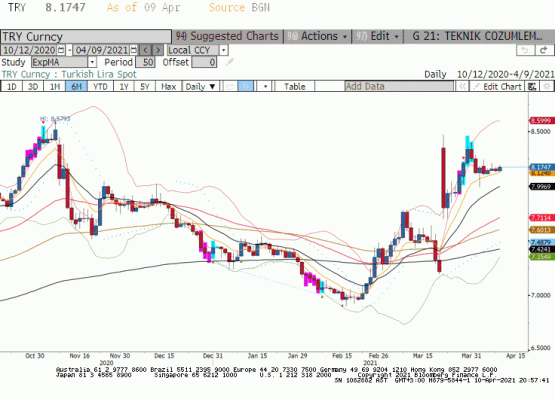 Bu haftanın geneline baktığımızda ABD Mart ayı enflasyon rakamı ve küresel enflasyon eğilimi ile tahvil getirilerindeki eğilim ve Dolar Endeksi takip edilecek. Dolar Endeksi 92.40 seviyesi üzerine çıkmadığı sürece 50 günlük üssel hareketli ortalaması olan 91.70’e doğru geri çekilebilir. Bu durum gelişen ülke para birimleri için pozitif olacaktır. Ancak bizim için önemli olan 15 Nisan PPK toplantısı ve bankanın fiyat istikrarı konusunda vereceği mesajlar olacaktır. Beklentiler politika faizinin yüzde 19 seviyesinde korunacağı yönünde oluşurken ileriye dönük faiz indirim zamanlaması kurda etkili olacaktır. Mevcut yüksek enflasyon ortamında ne kadar geç o kadar makul görülen faiz indirim süreci TL’de değer kazanımına destek verebilir. Geçtiğimiz hafta dar aralıkta kalarak 8.0000 TL altında fiyatlamada isteksiz görünen Dolar/TL paritesinin bu hafta hareket için yeni bir aralık belirleyeceğini düşünüyoruz. Opsiyon piyasasında düşen oynaklık bu hafta PPK ardından TL’nin değer kazanımına destek olabilir.