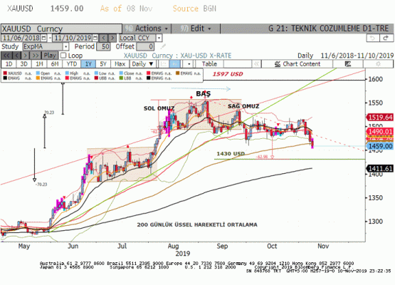 Gün içi grafiklerde aşırı satım bölgesinden çıkış hareketi ile 1448 usd seviyesinden yükselişe geçerek 1450 üzerinde tutunan Altın ons piyasasında 1469-1473 seviyeleri kısa vadede kuvvetli dirençler olarak takip edilmelidir. Omuz baş omuz formasyon hedefi olan 1430 usd seviyesine kadar satışların devam edebileceği yönündeki düşüncemizi koruyoruz. Yıl içinde nisan-mayıs aylarında önemli bir destek görevi gören 200 günlük üssel ortalamanın geçtiği 1411 usd seviyesi dip olabilecek kuvvetli destek olarak takip edilmelidir.