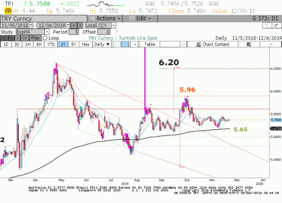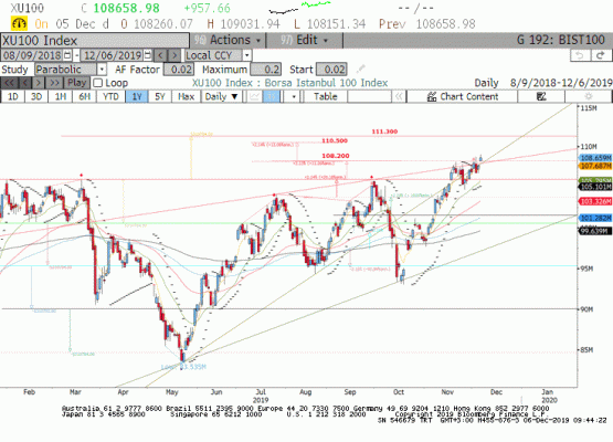 Parite dün Powell'ın 2020 yılı için faiz artırımının gündemde olmadığı mesajını vermesi ile 1.11 üzerine kırılım yaptı. 5 kasımdan beri kuvvetli direnç olarak çalışan 100 günlük ortalamanın geçtiği 1.11 seviyesinin kırılması teknik açıdan çok olumlu bir işaret.