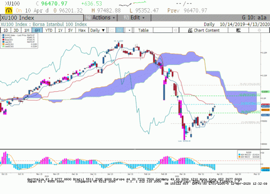 Dışarıda küresel piyasalarda geçtiğimiz haftalara kıyasla artan risk alma eğilimi içeride IMF swap alternatifi ile içeride dolar likiditesi sağlanabilir beklentisi birleşince BIS100 96.470 seviyesinde yükseliş ile haftayı kapattı. Türkiye'nin Mart ayı sonunda Fed'den swap kanalı açılan ülkeler arasına girme talebinin olduğuna ilişkin haber akışının da bu beklentiyi artırdıgını ekleyelim. Bu hafta 17-18 Nisan tarihlerinde IMF görüşmeleri ekonomik takvim içinde yer alıyor. Öncesinde kurum (IMF) Türkiyenin de içinde olduğu üye ülkeler ile görüşmeler yaptığını açıklamıştı. Hafta sonu Sn İbrahim Kalın'ın yaptığı açıklamada IMF'ten krizin etkilerini azaltmak için bir kaynak talebi olmadığı açıklandı. Dün akşam saatlerinde gelen genelge ile Bankalar için dışarıdan swap limiti özkaynaklarının yüzde 10'undan yüzde 1'e çekildi. Bu adım yurt dışı yerleşik yabancının TL spekülasyon yapmasını zorlaştırıyor. Aynı zamanda bankaların swap piyasasında TCMB dışında kaynak sağlama imkanı minimuma inmiş oluyor. Dün açıklanan swap hamlesi ile IMF ile bir swap hattı üzerinden dolar likiditesi sağlama beklentisi sorgulanıyor. Haftanın ilk işlem gününde Amerika açılıyor ancak Asya ve Avrupa paskalya tatili sonrası kapalı olacak. Cuma gününe benzer kendi içimizde fiyatlamaların olduğu bir gün olacak diyebiliriz. Cuma günkü bültende 97.200 direncine kadar bir hareket beklediğimizi belirtmiştik. Bu seviyenin yukarı yönde kırılması ile BIST100 endeksi 101.000 direncine doğru yükselişini sürdürebilir.
