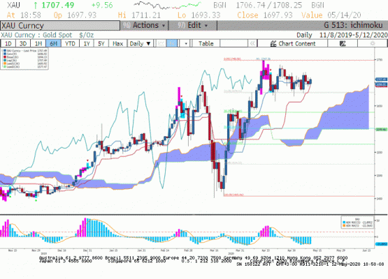12 Mayıs seansında ons altın 1.700 dolar üzerinde kalmayı başararak hafta başına kıyasla güçlenen bir görünüm sergiledi. Teknik üçgen formasyonu olışumunun bitmesi ile kırılmanın yönü önemli görülürken yakın bir zamanda bir hareket bekliyoruz.
