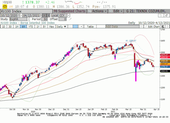 Gün içinde en düşük 1352 seviyesini gören BIST100 endeksi küresel piyasalardan aldığı pozitif hava ile destek buldu ve kapanış 1386 seviyesinde gerçekleşti. Endeks içinde gayrimenkul, sağlık, IT ve enerji sektörü hisse senetleri değer kaybederken madencilik sektörü %1.00 üzerinde değer kazandı. Öncesinde satış baskısı gözlenen mali sektör %0.24 değer kazandı sanayi sektörü ise %0.05 değer kaybetti. Dün açıklanan Şubat ayı sanayi üretimi verisi %0.1 artarken yıllık artış %8.8 olarak gerçekleşti. Türkiye tarafında bugün açıklanacak önemli bir veri görünmez iken 15 Nisan konut satışları, Merkezi yönetim bütçesi ve 14:00 de PPK toplantısı ile veri takvimi yoğun görünüyor. ABD hisse senedi piyasalarından yayılan küresel iyimserliğin devamı ile BIST100 endeksi bugün 1400 direncini test edebilir. Öte yanda 13 Nisan düşük seviyesi olan 1352.74 altında 200 günlük üssel hareketli ortalama 1340 destek olarak önemini koruyor.