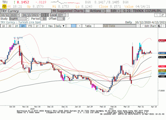 Seans içinde 92.30 endeks seviyesine yükselen Dolar Endeksi (DXY) sonrasında yaşanan geri çekilme ile 92.00 altında kapanış yaptı. Dün açıklanan ABD Mart ayı enflasyon verisi %0.6 artış ile beklenti üzerinde gerçekleşti ve yıllık enflasyonu %2.6’ya taşıdı. Beklenti üzerinde enflasyon ile piyasa algısı arasında ikilem yaşanırken 10 yıllık tahvil getirisi 1.65 sınırına doğru geri çekildi. Yine tüfe sonrası ABD hisse senedi piyasalarında yükseliş yaşandığını gördük. Anlaşılan enflasyonda yükselişin ılımlı olduğunu düşünüyor. Bu anlayış ile küresel piyasalarda artan risk iştahı gelişen ülke para birimlerinin değer kazanmasını sağladı. Buna rağmen Dolar/TL paritesi 15 Nisan PPK toplantısını beklerken 8.1000 TL altında fiyatlama için zorlanıyor.