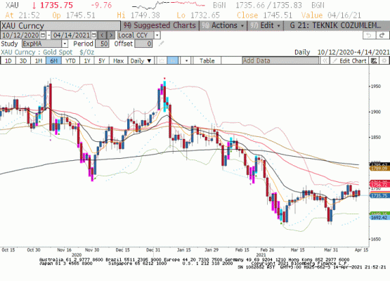 Salı günü 1740 dolar üzerinde kapanış ile ons altın 1760 direncine doğru yükselebilir görüşünü ifade etmiş tik. Dünkü seansta yaşanan harekete bakıldığında bir gün 10 dolar artı bir gün 10 dolar eksi yatırımcının altın performansından emin olmadığını görüyoruz. ABD Mart ayı tüfe ile bir miktar enflasyon fiyatlaması yapıldı bir sonraki gün piyasa iştahlı alımlara geçerken Dolar Endeksindeki düşüşe rağmen altın da geriledi. Bugün ve hafta boyunca ons altın 1725 dolar üzerinde kalabilirse 50 günlük üssel hareketli ortalaması olan 1757 dolara doğru yükseliş eğilimi korunabilir. Aksi durumda ilerleyen günlerde 1700 dolara doğru geri çekilme ihtimalinden söz edeceğiz.