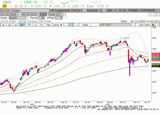 Küresel hisse senedi piyasalarında pozitif fiyatlamalar dünkü seansta BIST100 endeksine olumlu yansıdı. Aynı zamanda psikolojik olarak önemli olan 1400 endeks seviyesi üzerinde kapanışı olumlu görüyoruz. Küresel iyimserlik TCMB’den gelen mesajların değerlemesi ile BIST100 geçtiğimiz haftanın yüksek seviyesi olan 1445’e doğru yükselişini sürdürebilir. Endekste taşıyıcı görevi gören hisse senetleri dün ilgi görürken kanal İstanbul projesine ilişkin açıklamalar ile gayrimenkul sektörü %5.41 değer kazanımı ile ilk sırada yer aldı. Madencilik yine ön sıralarda mali sektörün %3.38’lik değer kazanımının da piyasaya moral verdiğini görüyoruz. ABD hisse senetleri dün beklenti üzerinde Goldman Sachs bilançosu ile yükselirken petrol stoklarında düşüş ardından ham petrol fiyatları enerji sektörüne destek oldu. Teknik olarak günlük grafikte daralan bollinger bant kırılma zamanını işaret ederken 13 Nisan seansı 1352.74 ardından kısa vadede düzeltme misyonunu tamamlayan endeksin 1445 üzerinde 22 Mart aralıklı açılışı doldurmak isteyebilir.