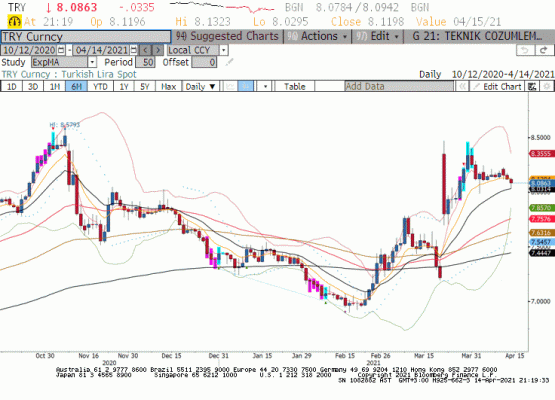 Döviz piyasasında Dolar Endeksi 91.70 altına gerilerken içeride Dolar/TL paritesi gün içinde en düşük 8.0295’i gördü. Küresel piyasalarda iyimserlik ve gelişen ve gelişmiş ülke para birimlerinin değer kazanıyor oluşu TL pozitif fiyatlamaya destek oldu. Bugün yapılacak PPK toplantısını beklerken 8.1000 TL altında fiyatlama için zorlanan paritenin bugün 8.0000 TL altında fiyatlama için istekli olacağını düşünüyoruz. Ancak tabi ki önemli olan gün içinde görülen 8.0000 TL altında fiyatlamadan sonra paritenin tekrar yükselişe geçip geçmeyeceği olacak. İyi senaryoda 7.7500 alt bant PPK toplantısının beklentiyi karışlamadığı senaryoda 8.2500 üst bant olarak takip edilebilir.