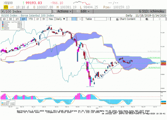 BIST100 endeksi küresel hisse senedi piyasalarında yaşanan satış baskısından nasibini aldı ve günü 966 puan düşüş ile 99.193 seviyesinde kapadı. Türkiye 5 yıllık CDS primi 630 seviyesine yükseldi. BIST100 endeksi içerisinde lokomotif bankacılık sektöründe son beş seansta 2.886 puanlık geri çekilme endeksi aşağı çekti. Hizmetler sektöründeki satış baskısı limitli kalırken sınai sektörünün de dünkü seansta geri çekildiğini gördük. Kredi derecelendirme kuruluşu Fitch'ten gelişen ülke piyasalarında pandemi etkisinin bankacılık sektörü üzerindeki riski artırdığı açıklaması negatifti. Öte yanda Mart ayı takvim ve mevsimsellikten arındırılmış sanayi üretimi endeksi aylık yüzde 7.1 düştü. Böylece sanayi üretiminde yıllık gerçekleşme %-2.00 olarak piyasa beklentisi üzerinde gerçekleşti. Nisan ayı sanayi üretimi rakamındaki düşüşün daha sert olabileceği endişesi ile 14 Mayıs seansında hisse senedi piyasalarının negatif fiytalamaya geçtiğini gördük. Öte yanda Çin ile ilk faz ticaret müzakerelerine devam etmek için Amerika'nın pek niyetli olmadığı anlaşılıyor. Başkan Donald Trump öncesinde emeklilik fonlarının Çin hisse senedi alımlarına kısıtlama getirebilineceğini açıklamıştı. Son açıklaması ile bu görüşün arkasında durduğu anlaşılıyor. FED Powell konuşması sonrasında ekonomik iyileşmenin beklenenden yavaş olacağını ve resesyon endişesini fiyatlayan piyasalarda ticaret savaşları riski satışların hız kazanmasını sağladı. Kapanışa doğru Amerikan hisse senedi piyasalarında yaşanan yükseliş ile pozitif kapanış gerçekleşti. İçeride swap anlaşmaları ile TL'in değer kazanımı ve dışarıda ılımlı pozitif fiyatlama ile bugün BIST100 endeksi tekrar 100 bin direncini deneyebilir.