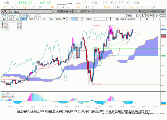 Ons altında birkaç gündür teknik üçgen formasyonu daralıyor kırılma zamanı yaklaşıyor yönünde dikkat çektiğimiz hareket 14 Mayıs seansında gerçekleşti. Onsa latın 1.720 dolar üzerinde hızlı bir hareket ile 1.730 dolar üzerine çıktı. Aklın yolu bir düşük faiz ortamında ons altında devam eden orta vadeli yükseliş trendinin önüne geçebilecek gelişmeler; piyasanın endişe duyduğu hisse senedi piyasalarında 2. sert bir satış dalgası ile likiditasyon süreci ve ihtiyaç mukabili Merkez Bankaları'nın piyasada altın satışı olabilir. İlk risk unsuru her zaman için olası ve ekonomik koşulların bu derece kötü olduğu ortamda her an risk iştahının kaçması muhtemel. İkinci risk unsuru için ak akçe kara gündür atasözümüzden yola çıkarak o kara günün gelmesi gerekiyor ve sanırım henüz gelmedi. Buna rağmen hisse senedi piyasalarının ekonomik iyileşme sürecine sağladığı moralite düşünüldüğünde belki de kesik kesik ama ılımlı geri çekilmeler ile bu süreç atlatılabilir.