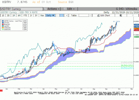 USD/TRY paritesi geçtiğimiz işlem günü 7,8991 ile 7,9587 bandında hareket ettikten sonra akşam saatlerinde 7,9096 seviyesinde dengelendi. Gün içerisinde Cumhurbaşkanı Erdoğan'ın doğalgaz rezervleri ile ilgili müjdeli haber vereceği yönünde açıklamaları TL varlıkların değer kazanmasına yol açarken akşam saatlerinde kurda gerilemenin ön plana çıktığını gördük. Diğer yandan akşam saatlerinde DXY'de akşam saatlerinde teşvik paketleri ile ilgili belirsizliğin de etkisi ile geri çekilmenin ön plana çıktığını gördük.