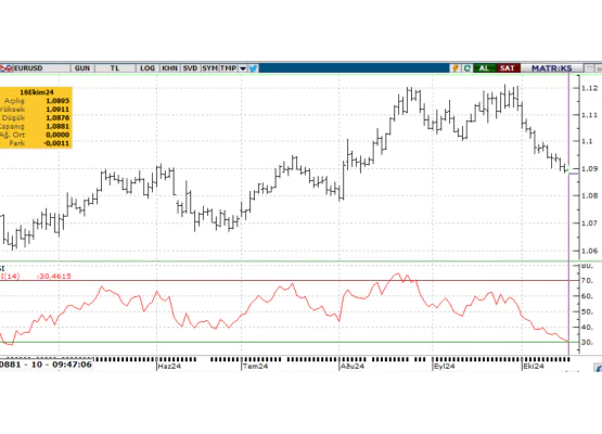 EURUSD; Haftanın ikinci iş gününde EUR/USD paritesi 1,0888 seviyesine kadar geriledikten sonra günü %0,16 kayıpla 1,08904 seviyesinde tamamladı. Paritenin 1,09 desteğinin altına sarkmasıyla aşağı yönlü baskının devam ettiğini gözlemliyoruz. Teknik göstergeler, düşüş eğiliminin korunduğunu ve kısa vadede 1,08 – 1,10 aralığının etkili olabileceğini işaret ediyor. Bu bağlamda, 1,0875, 1,0850 ve 1,0820 seviyeleri destek; 1,09, 1,0915 ve 1,0950 seviyeleri ise direnç olarak öne çıkıyor.