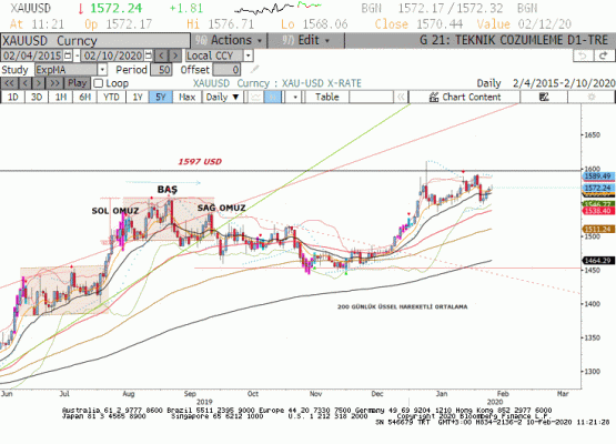 Teknik açıdan çift tepe oluşumu gözlenen 1590 usd bugün kritik direnç olarak takip edilecek iken aşağıda 1574-1570 destekleri kısa vadeli periyotlarda alıcıların artabileceği seviyelerdir.