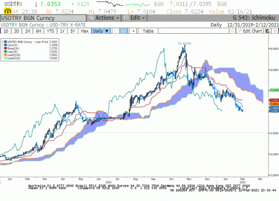USD/TRY paritesi geçtiğimiz, gün içinde 6,9657 ile 7,0584 bandında hareket ettikten sonra akşam saatlerinde 6,9666 seviyesinde dengelendi. Hafta ortasında Bullard'ın enflasyonda 2021 yılı içinde yükseliş bekledikleri yönündeki açıklamaları sonrası ABD tahvil faizlerinde yaşanan yükseliş sonrası DXY'de yaşanan tepkinin kalıcı olmadığını gözlemledik. Özellikle FED'in varlık alımlarına devam edecekleri yönündeki açıklamaları DXY'de yükselişin sınırlı kalmasını sağladı. Ancak sınırlı yükselişe rağmen Dolar gelişmekte olan para birimleri karşısındaki değer kazancını korudu. Bugün TCMB faiz kararını takip ediyor olacağız. Faiz oranlarında değişiklik beklememek ile birlikte gün içinde volatilitenin yüksek olabileceğini düşünüyoruz. Bunun yanında kısa vadede 6,80 beklentimizi koruyoruz.