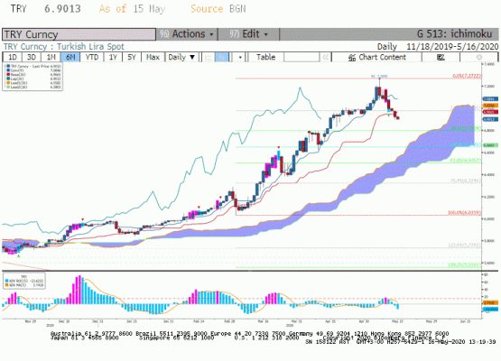 Haziran vadeli Dolar/TL paritesi dışarıda Dolar Endeksi'nin değer kazanımına rağmen 7.000 TL altında kalmayı başardı. Türkiye 5 yıllık CDS primi 625.360 seviyesinde kapanış yaptı. Tahvil bono piyasasında son aktif rasyo değişikliği ardından bankaların alımlarına karşılık yabancı yatıtımcının satış tarafında olduğu anlaşılıyor. Çıkışların daha ziyade 2023 vadeye kadar olan kısa vadeli bonolarda olduğu söyleniyor. TCMB'in Mayıs ayı toplantısında da politika faizini aşağı çekmesi beklenirken tahminler 50 baz puanlık bir faiz indirimi ile politika faizinin 8.25 seviyesinde olacağını gösteriyor. Sene başından bu yana TL Amerikan Doları karşısında yüzde 14.86 değer kaybı ile 24 gelişen ülke para birimi arasında 19. sırada yer alıyor. Son beş seansa bakıldığında ise TL'in Amerikan Doları karşısında yüzde 2.70 değer kazandı ve gelişen ülke para birimleri tablosunda ilk sıraya yükseldi. Bu hareket yabancı yatırım bankalarının TL'de açığa satışları konusunda alınan önlemler ile başlayan düşüş hareketinin TCMB'in ticaret ortagı olduğumuz ülkeler ile swap anlaşması beklentisine bağlanabilir. Henüz net bir gelişme olmamakla beraber bu beklenti TL'de değer kazanımı için itici güç diyebiliriz.
