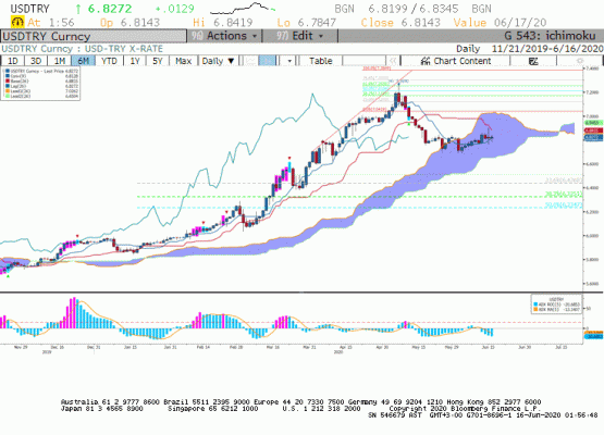 USD/TRY paritesi 6,85 seviyesini test etmeye devam ediyor. Yurtiçi talebin hala devam ediyor olması ve yabancı çıkışları, paritede geri çekilmeyi sınırlamaya devam ediyor.