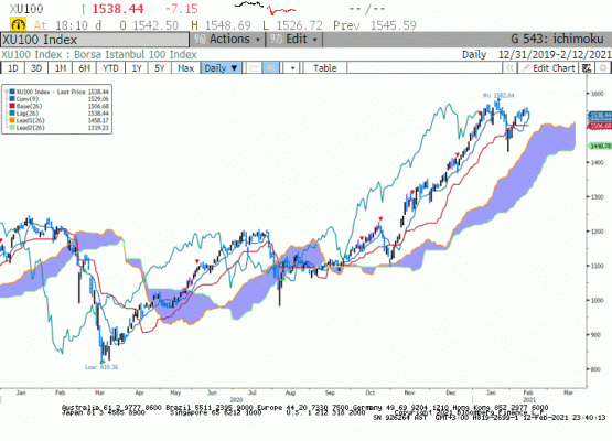 Gün boyunca pozitif bir seyir izleyen BIST 100 endeksi Türkiye Cumhuriyet Merkez Bankası'nın (TCMB) faiz kararının ardından 1.560,00 puanın üzerini test etti ve daha sonra 1.545,00 puanın üzerinde dengelendi. TCMB Para Politikası Kurulu, politika faizi olan bir hafta vadeli repo ihale faiz oranının yüzde 17 düzeyinde sabit tutulmasına karar verdi.