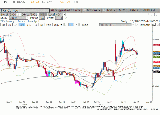 Dışarıda Dolar Endeksi 91.75 altında düşüş eğilimini koruyabilir ve endeks 90.30 seviyesine doğru geri çekilebilir. Arada yaşanan yukarı yönlü tepkilere rağmen Dolar Endeksinin bu hafta da aşağı yönlü haraketlini sürdüreceğini düşünüyoruz. Bu senaryoda gelişen ve gelişmiş ülke para birimlerinin değer kazanması muhtemel iken Dolar/TL paritesi 8.0000 TL altında fiyatlamaya geçebilir. Son beş işlem gününde Türk Lirası ABD Doları karşısında %1.35 değer kazancı ile 24 gelişen ülke para birimi arasında 4. Sırada yer aldı. Paritede 8.0000 TL altında fiyatlama ile 7.8000 desteğine doğru geri çekilme mümkün olabilir. Ancak içeride daha olumlu fiyatlama için yatırımcının hoşuna gitmeyen birtakım gelişmeler var. Perşembe günü Nisan ayı tüketici güveni ve menkul kıymet istatistikleri dışında önemli bir veri görünmüyor. Geçtiğimiz hafta bono piyasasın limitli olmakla beraber yabancı yatırımcı giriş olurken hisse senedi tarafında çıkış devam etti. Merkez Bankası rezervlerinin geçmişe kıyasla düşük denebilecek seviyede oluşu ve yılsonuna kadar enflasyonun mevcut yüksek seviyeleri koruyacağı beklentisi TL’nin değer kazanımını limitliyor.