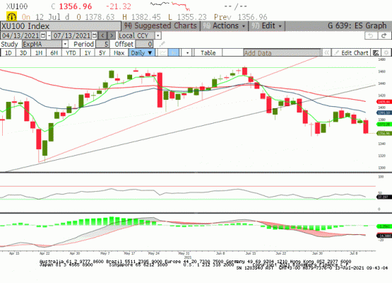 Özellikle 14 Temmuz günü 200 günlük üssel hareketli ortalamanın kırılmasıyla oldukça güçlü bir konuma gelen Ons Altın 1820 doların üzerinde gerçekleştirdiği kapanış ile beraber trendin gücünü artırmış oldu. 1840 seviyelerinde en güçlü direncin bulundugu seviyeler olarak karşımıza çıkarken bu seviyeler geçildiği takdirde yükseliş hız kazanabilir ve daha sert ve hızlı yükselişlerle ilk etapta geçtiğimiz yaz oldugu gibi 1900 doların üzerilerini görebiliriz.