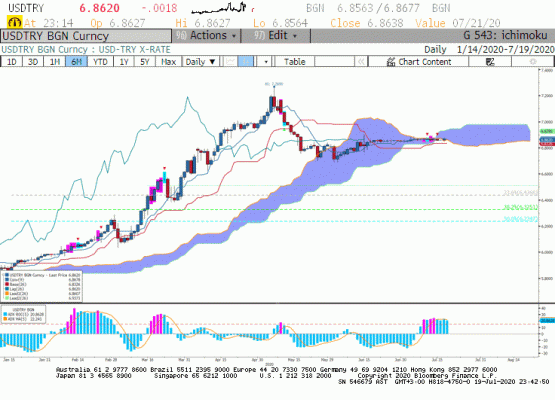 USD/TRY paritesi haftanın son işlem günü 6,8436 ile 6,8776 bandında hareket ederken haftayı 6,8578 seviyesinden kapattı. Hafta sonu yapılan açıklamada TCMB normalleşme sürecinin bir parçası olarak, finansal istikrarın desteklenmesi amacıyla, yabancı para zorunlu karşılık oranlarının tüm bankalar için tüm yükümlülük türlerinde ve vade dilimlerinde 300 baz puan artırılmasına karar verdi. Alınan bu kararla, piyasadan yaklaşık 9,2 milyar ABD doları tutarında Döviz ve altın cinsinden likidite çekilmesi beklenmektedir. Söz konusu değişiklik, tesisi 24 Temmuz 2020 tarihinde başlayacak olan 10 Temmuz 2020 tarihli yükümlülük döneminden itibaren geçerli olacaktır. Bu karar ile birlikte hafta içerisinde paritede volatilitenin arttığını görebiliriz.