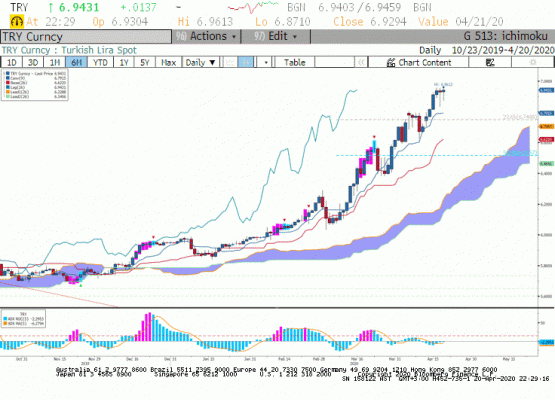 Teknik olarak, ichimoku sinyal çizgisi 6.7900'un aşağı yönde kırılması Dolar/TL paritesinin 6.6500 desteğine kadar geri çekilmesini gündeme getirir. Öte yanda dün gün içinde görülen düşük seviye 6.8710 iken kapanış 6.9400 üzerinde gerçekleşti. Yükseliş trendi sürüyor ve kısa vadede henüz bir dönüş sinyali göremiyoruz.