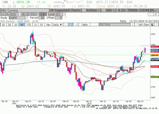 02 Nisan ile başlayan haftada 1728 dolar/ons seviyesinde kapanış yapan ons altın yaklaşık 140 dolar yükseldi. FED tutanakları öncesinde 1890 dolar test edildi toplantı tutanakları sonrasında tapering endişesi ile fiyatlar geriledi. Hızlı yükselişin ardından 1850 dolar üzerinde denge bulmaya çalışan altın fiyatları bu eğilimi koruyabilir ise orta vadede yükselişini sürdürebilir. Bu haftanın kapanışının 1850 dolar üzerinde olmasını önemsiyoruz. Zira bu seviye altında kapanışlar yatırımcının ilgisinin başka taraflara kaydığı anlamına gelebilir. Kripto varlık piyasasında yüksek dalga boyları ile bir kısım yatırımcının bu piyasadan çıkarak altın EFT’lerine yönelmesi pozitif ancak devamının gelmesi gerekiyor. Öyle ki son 7 günde yaşanan girişlere rağmen altın ETF’leri sene başından bu yana %6.3 gerilemiş görünüyor.