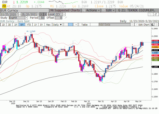 Dolar Endeksi 20 Mayıs senasına 90.00 endeks seviyesi üzerinde hareket ile başladı. Sonrasında ABD ekonomik verilerinde beklenti altında gerçekleşme ve Dolar Endeksi’nin 90.00 altına gerilemesi pariteyi 1.2200 üzerine taşıdı. Bugün Amerika ve Avrupa Bölgesinde Mayıs ayı PMI imalat ve servis sektör endeksleri açıklanacak. Avrupa Bölgesinde bugün açıklanacak Mayıs ayı PMI imalat sanayi endeksi verileri (ilk okuma) iyileşme gözlendiği takdirde paritede volatilite artışı ile 1.2250 direncini test etmek isteyebilir. Öte yanda Euro ve diğer gelişmiş ülke para birimleri performansında asıl olan FED ’in varlık alım miktarına ilişkin tartışmalar ve küresel enflasyon bekleyişi diyebiliriz.