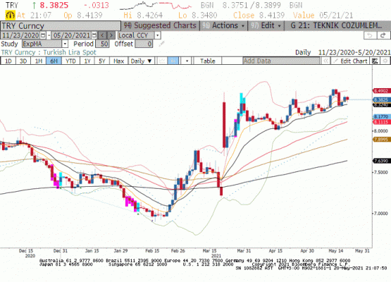 20 Mayıs seansına aylık bazda volatilite düşüşü ve değer kazanımı ile başlayan Türk Lirası’nın sonrasında bu kazanımları korumakta zorlandığını gördük. Yine de son beş işlem gününe bakıldığında Türk Lirası ABD Doları karşısında %1.88 değer kazanımı ile 24 gelişen ülke para birimi arasında 2. Sırada yer aldı. 5 yıllık CDS risk primi önceki güne kıyasla limitli olmakla beraber düşerek 403 civarında günü kapattı. 2 yıllık gösterge faiz oranı %18.29 ve 10 yıllık tahvil faiz oranı %18.21 seviyesinde kapanış yaptı. FED önümüzdeki toplantılarda varlık alımlarını azaltmayı tartışabilir gündemi ile Döviz piyasasında Dolar Endeksi 90.00 seviyesi üzerinde işlem görürken dün açıklanan ABD ekonomik verilerinin beklenti altında kalması ile 90.00 seviyesi altına geriledi. FED’in istihdam başta olmak üzere ekonomik veriler istenilen seviyeye ulaşıncaya dek ekonomiyi destekleme sözü artık daha sık sorgulanmaya başlayacak. Bu koşullar gelişen ülke para birimleri için negatif olsa da gelişmiş ülke merkez bankalarının bünyelerinde artan enflasyon eğilimine rağmen tapering (varlık alımlarını azaltmak) için aceleci olmayacağını düşünüyoruz. Bu durumda dışarıdaki gelişmeler tehdit olsa da içeride ekonomik veriler ve enflasyonist eğilim ile Dolar/TL yön aramaya çalışacaktır. Bu tarafta dün açıklanan akaryakıt ürünlerinden alınan ÖTV oranlarında yapılan yukarı yönlü güncellemenin enflasyonist eğilime destek olacağı gerçeği var. Günlük grafikte kısa vadeli göstergeler aşağı yönlü düzeltme sinyali verirken 18 günlük üssel hareketli ortalama 8.3250 altında TL’nin değer kazanımı zamana yayılabilir. Aksi takdirde Dolar/TL paritesi tekrar 8.5000 seviyesini test etmek için istekli olabilir.