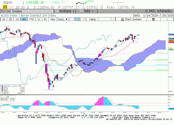 Küresel piyasalarda ise kapanışta karışık seyir devam ederken bu hafta pandemi krizi ile ilgili gelişmelerin yanı sıra yurt içinde açıklanacak faiz oranları kararı önemli olacak. Gün içerisinde yeniden 117.500 seviyesi önemli destek, 120.000 seviyesi ise önemli direnç olarak ön plana çıkmaktadır.