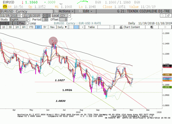 Dün yapılan negatif kapanışa rağmen 50 günlük ortalama 1.1065 üzerinde devam eden tutunma ile 100 günlük ortalama 1.11 seviyesine hareket potansiyeli devam ediyor. 1.11 seviyesini kuvvetli direnç olarak takip ediyoruz. 1.1065 altına kırılım durumunda ise piyasanın yatay eğilimine devam etmesini ve 1.1027 ile 1.10 seviyelerinin kuvvetli detsek olmasını bekleriz.