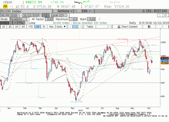 Teknik açıdan 98.000(200 günlük üssel ortalama) üzerinde tutunmanın sağlanması önemli olacaktır. Takip ettiğimiz seviyeler 100 ve 50 günlük üssel ortalamaların bulunduğu 98.500 ve 99.400 seviyeleridir. Bugün 97.400 önemli bir destek olabilir.