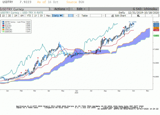 USD/TRY paritesi geçtiğimiz gün, gün içinde 7,7812 ile 7,9788 bandında hareket ettikten sonra akşam saatlerinde 7,9440 seviyesinden dengelendi. TCMB Ekim toplantısında politika faizinde değişikliğe gitmeyerek yüzde 10.25'te tuttu. Dolar/TL kuru, Türkiye Cumhuriyet Merkez Bankası'nın (TCMB) Ekim toplantısı öncesinde 7.78'lere kadar çekilmişti. Toplantıdan sonra 7.9797'ye yükselerek rekor kıran kur akşam saatlerinde 7,94 seviyelerinde dengelendi. TCMB, geç likidite faizi ile gecelik borç verme faizinin farkını 150 baz puandan 300 baz puana çıkardı. Merkez Bankası'nın kararı ile birlikte GLP faizi yüzde 13.25'ten yüzde 14.75'e yükselmiş oldu.