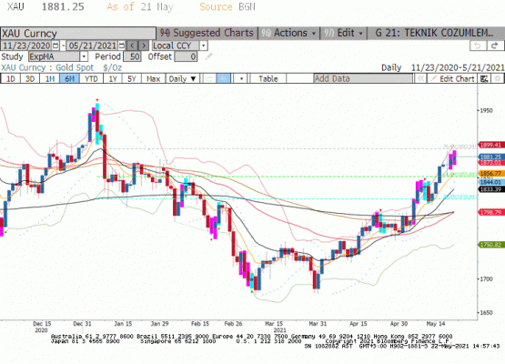 Ons altın fiyatları 1841-1890 arasında hareket ardından 1881.25 seviyesinde kapanış yaptı. Enflasyon geçici mi kalıcılı olacak sorusuna cevap ararken emtia piyasasında yaşanan aşağı yönlü düzeltme ile risk iştahı korunabildi. Piyasaların enflasyon konusuna hassasiyeti ve Dolar Endeksi’nin yönü bu hafta da altın fiyatlaması üzerinde etkili olacak. Öte yanda uzun vadeli tahvil faiz oranlarındaki yükseliş eğiliminin yerini yatay harekete bırakmış olmasını bu dönemde altın için avantaj olarak görüyoruz. Alternatif piyasalarda kripto varlıklarda gözlenen satış baskısı ve büyüyen dalga boyları ile bu tarafta nakde dönme isteği de altın ayarmış görünüyor. Sene başından bu yana bakıldığında altın EFT’leri %6.1 düşüş ile 100.5 milyon ons seviyesine geriledi. Ancak son 8 işlem gününde kademeli olarak alımların olduğu ve ETF yatırımcısının altına geri döndüğü anlaşılıyor. 06 Mayıs tarihinde 99.431 milyon ons olan altın EFT’leri 21 Mayıs tarihinde 100.783 milyon ons seviyesine yükseldi. COMEX’te fon alımlarına gelince son dört haftada 40389 kontrat alım ile 252270 kontrata yükseldi. Son 12 haftanın yüksek seviyesinde olan net uzun pozisyonu kısa vadede yüksek seviyede görünse de geçtiğimiz sene rekor pozisyon seviyelerine bakınca gidecek yolu var. Bu çerçevede altın piyasasında yaşanacak derin düzeltmeler alım fırsatı olarak görülebilir.