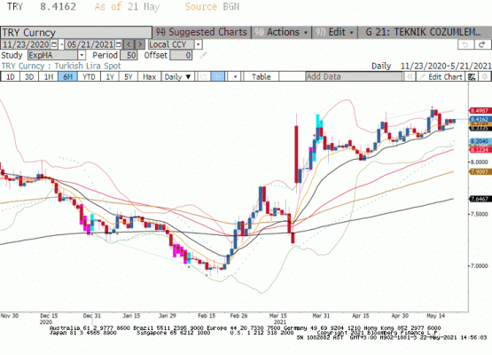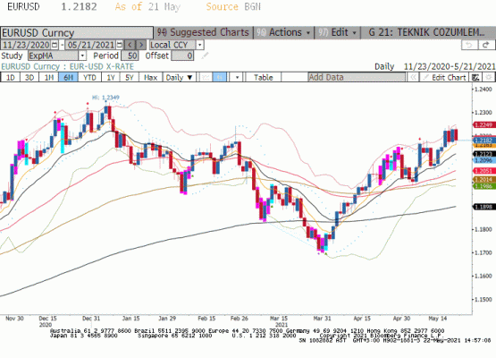 Geçtiğimiz hafta son beş işlem gününün dördünde 1.2250 seviyesine doğru yükselen parite bu seviyeyi geçmekte zorlandı. 1.2250 artık önemli bir sınır ve bu seviyenin aşılması ikinci raunt yükseliş hareketi anlamına geliyor. Geçtiğimiz haftanın son işlem gününde açıklanan Euro Bölgesi Mayıs ayı PMI imalat sanayi endeksi 62.8 servis sektörü PMI endeksi 55.1 olarak pozitif gerçekleşti. İngiltere PMI imalat ve servis sektör endekslerinin 60.00 seviyesi üzerinde iyileşmeyi sürdürdüğü görüldü. Pazartesi günü Avrupa ülkelerinde Almanya ve Fransa banka tatili nedeni ile kapalı olacak. Salı günü açıklanacak olan Alman IFO iş dünyası güven endeksinin 98.2 (önceki 96.8) olması bekleniyor. Aynı gün açıklanacak Euro Bölgesi ilk çeyrek büyüme rakamı %1.7 daralmayı işaret etse de bu durumun öncesinde fiyatlanmış olduğunu biliyoruz. Mayıs-Ağustos dönemi verilerinde aşılama ile gelen normal ekonomik aktivite ve iyileşen ekonomik veriler ile Euro’nun değer kazanımı sürebilir. Ancak kısa dönemde enflasyonu ve otoritelerin olası tepkisini anlamaya çalışan döviz piyasası Euro iyimser fiyatlamanın devamı için zorlanıyor.