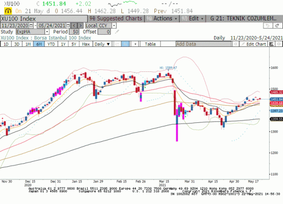 Geçtiğimiz hafta içinde en yüksek 1465 seviyesini gören BIST100 endeksinde kapanış 1451.84 seviyesinde gerçekleşti. Hafta içinde küresel piyasalarda yaşanan geri çekilme sonrasında yerini yükselişe bırakmış olsa da artık FED varlık alımlarını azaltmayı tartışabilir beklentisi var. Enflasyon geçici mi kalıcı mı diye konuşulurken üyeler 2022 yılında ekonomide kullanım alanı yüksek olan hammadde fiyat artışlarının gerileyebileceğini düşünüyor. Eğer beklendiği gibi olmaz ve ise FED ve diğer gelişmiş ülke Merkez Bankaları sözlü, açık piyasa işlemleri ile ya da politika faizi ile enflasyonist eğilimi kırmak isteyecektir. Bu senaryo gelişen ülke piyasaları için negatif olmakla birlikte kısa dönemde saldırgan fiyatlanmaya gerek görülmeyebilir Henüz erken ve geçtiğimiz hafta emtia piyasasında fiyatlarda yaşanan aşağı yönlü düzeltme hafif de olsa rahatlama sağladı. Yaz aylarında Dünya genelinde enflasyonun seyrini piyasalar sıkı takibe alarak arada yukarı gitmekte zorlandığı dönemlerde geri çekilme için bahane edecektir. Geçtiğimiz haftaya bakarak 1308-1465 yükseliş hareketi ardından BIST100 endeksinin yeni yüksek seviyelerde zorlandığını görüyoruz. Teknik olarak, bu hafta 1435 endeks seviyesi üzerinde kaldığı sürece yükseliş denemeleri sürebilir. Öte yanda 1465 yukarı yönde kırılmadan yeni yüksek seviyeler zor görülüyor.