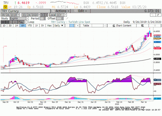 24 Mart seansında küresel piyasalarda pozitif hava ve Dolar Endeksinde düşüş ile içeride TL değer kazanırken Dolar/TL paritesi 6.4500 seviyesine doğru geri çekildi.Opsiyon piyasasında 3 aylık zımni volatilite 18.54 (önceki 20.25) iken 25 Delta Risk Reversal 6.88 ile Türk lirası lehine rahatlama olduğunu gösteriyor..Kısa vadeli göstergelerde biriken 'satış sinyalleri' ve dışarıda döviz piyasasındaki olumlu havanın devamı ile paritede düşüş devam edebilir.