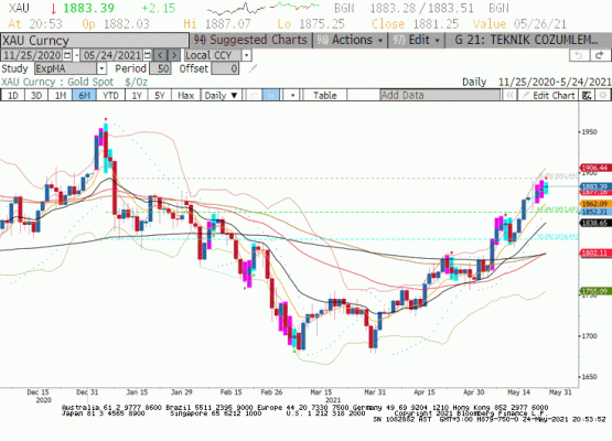 Ons altın fiyatlarının 1890 dolar üzerine yerleşmesi için zamana ihtiyaç var. Dolar Endeksi 90.00 altında işlem görüyor 10 ve 30 yıllık tahvil faiz oranları altını rahatsız edecek bir yükseliş eğiliminde görülmüyor küresel risk iştahı yerinde ama altın 1890 direncini aşamıyor. ETF borsa yatırım fonlarına girişlerin 254.137 troy ons ile devam etmesi pozitif halen sene başından bu yana %5.9 çıkış var. Ancak son 8 işlem gününde yaşanan girişler ile ETF yatırımcısının altına ilgisinin arttığı gözleniyor. Haziran ayı FED toplantısı yaklaştıkça banka varlık alımları tartışmaya başlayacak mı endişesi altın fiyatlarını şimdiden baskılıyor olabilir. Buna rağmen kısa vadede Dolar Endeksi ve emtia piyasasındaki fiyatlarda yaşanan yükseliş ile ne zaman müdahale edileceği şimdiden kestirilemeyen enflasyon altına destek verebilir.