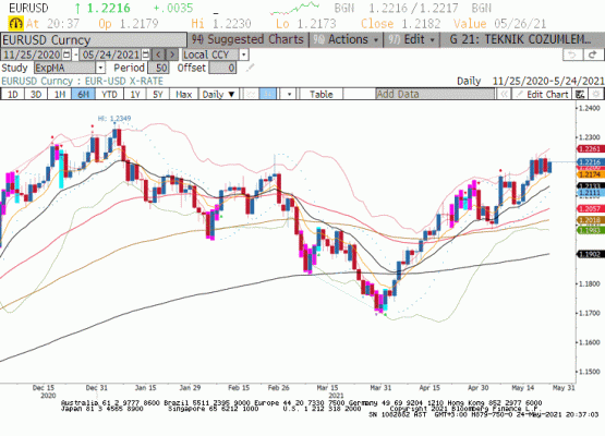 25 Mayıs yüksek seviyesi 1.2230 olan parite 1.2200 üzerinde kapanış yaparak yükseliş eğilimini sürdürme gayreti içinde iken Avrupa’da bazı ülkelerin tatil nedeni ile kapalı oluşu ile dikkatler ABD tarafındaki fiyatlamalardaydı. Dolar Endeksi 90.00 seviyesi altında işlem görüyor ve küresel risk alma eğilimi sürüyor. Bu koşullarda Euro/dolar paritesi yükseliş eğilimini korumakta sakınca görmedi. Önceki raporlarımızda belirttiğimi gibi 1.2250 seviyesi artık önemli bir sınır ve bu seviyenin yukarı yönde kırılması ile paritede Euro lehine pozisyonlanma hız kazanabilir. Öte yanda Haziran vadeli opsiyon kontratlarının sona ermesine 11 gün kalmışken yeni yüksek seviyeler görülebilecek mi?