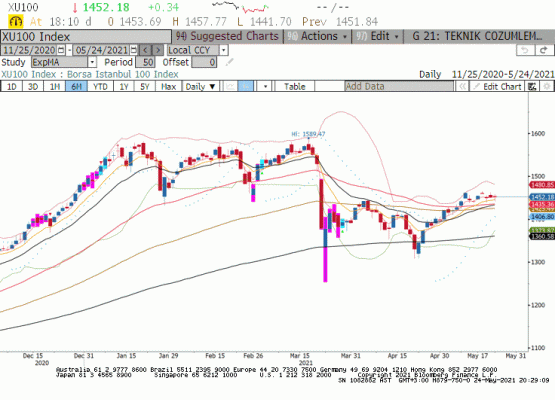 Gelişen ülke borsa yatırım fonlarına geçtiğimiz hafta 1 milyar dolar giriş olan haftaya başlarken BIST100 endeksinin yukarı gitmekte zorlandığını gördük. ABD’de işlem gören Türkiye EFT’lerine de geçtiğimiz hafta 4.1 milyon dolarlık giriş gerçekleşmiş. Detayda bono EFT’lerine 9.8 milyon dolar giriş olurken hisse EFT’lerinden 5.7 milyon dolar çıkış gerçekleşmiş. Sene başından bu yana ABD’de işlem gören gelişen ülke EFT’lerine toplamda 26.2 milyar dolar giriş bu tarafa olan ilginin devam ettiğini gösteriyor. 1308-1465 yükseliş hareketi ile BIST100 endeksi bu ilgiden kısmen nasibini almış olmakla birlikte şimdilerde momentum kaybı olduğu gözleniyor. BIST100 endeksi en düşük 1441 seviyesini gördükten sonra 1452.18 seviyesinde kapanış yaptı. Teknik olarak, 1435 seviyesi üzerinde kaldığı sürece yükseliş eğilimi sürerken 1465 kısa vadeli direnç olarak görülüyor.