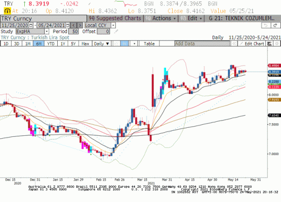 Dolar Endeksi haftanın ilk işlem gününde 90.00 endeks seviyesi altında işlem görürken gelişen ülke para birimleri ABD Doları karşısında gücünü korudu. 24 gelişen ülke para birimi arasında değer kazanımı olarak öne çıkanlar emtia paraları olurken Türk Lirası’nın son 5 işlem gününde ABD Doları karşısında %0.93 değer kaybettiği görüldü. İçeride Nisan ayı turist girişlerinin bir önceki senenin aynı ayına kıyasla keskin bir yükseliş göstermesi geçen senenin aynı ayının pandemi başlangıcına denk gelmesi ile ilişkili olsa da Haziran ayından iyi bir aşılama performansı yaz sezonunda turist girişlerinin artmasını sağlayabilir. Öte yanda geçtiğimiz hafta gelişen ülke EFT’lerine para girişlerinin 1 milyar dolar ile Nisan ayı başındaki yüksek seviyelere ulaşması ile küresel risk alma eğilimi korunuyor. ABD tahvil piyasasında 10 ve 30 yıllık tahvil faiz oranlarına gelince şimdilik gelişen ülke EFT’lerini de rahatsız etmiyor. Öte yanda ABD dışında dönen ticarette Dolar cinsi borçlanma için referans olan EuroDolar vadeli kontratlarında 2020 yılı Haziran ayından bu yana ilk kez net olarak kısa pozisyon taşıması piyasanın ABD Dolarında kısa vadeli borçlanma faiz oranında yükseliş beklendiğini gösteriyor. Haziran ayı FED toplantısı yaklaştıkça banka varlık alımları tartışmaya başlayacak mı endişesi ile gelişen ülke para birimlerinde oynaklık aratabilir. Ancak mevcut koşullar ile piyasa şimdiden bu alternatifi fiyatlamaya başlamak istemiyor.