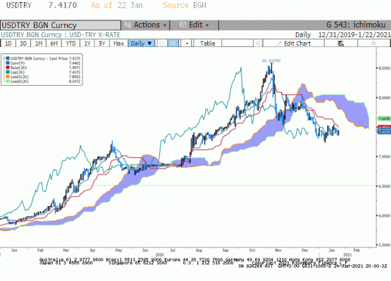 USD/TRY paritesi haftanın ilk işlem günü, gün içinde 7,3637 ile 7,4275 bandında hareket ettikten sonra akşam saatlerinde 7,4109 seviyesinde dengelendi. Gün içinde yurt içinde açıklanan veriler TL varlıklar üzerinde sınırlı etki yaratırken Dolar endeksinde sınırlı yukarı yönlü eğilim ile birlikte paritede 7,40 seviyesinin üzerinde destek bulma çabası yaşandığını görüyoruz. Buna rağmen TL gün içinde diğer gelişmekte olan ülke para birimlerinden pozitif ayrıştı. Önümüzdeki günlerde Dolar endeksinde yeniden alımların güçlenmesi halinde 7,55 seviyesi önemli teknik seviye olarak karşımıza çıkmakta. Diğer yandan geri çekilmelerde ise 200 günlük hareketli ortalama olan 7,30 seviyesi yakından takip edilecek.