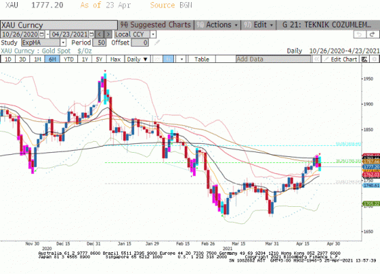 Ons altın fiyatları 22 ve 23 Nisan tarihli yüksek seviyeleri 1798 ve 1796 seviyeleri üzerinde hareket için zorlanarak haftayı 1777.2 dolar seviyesinde kapattı. Nisan ayı başından bu yana ABD uzun vadeli tahvil getirilerindeki geri çekilme altın fiyatlarında yükselişe destek vermişti. ABD 10 yıllık tahvil faiz oranları yüzde 1.5577’de kapanış yaparken bu hafta yapılacak FED toplantısı ve enflasyon konusundaki söylemleri beklerken getirilerde yaşanan geri çekilme hız kesebilir. Altın piyasası bu öngörü ile 1800 dolar/ons üzeri fiyatlamaya geçmekte zorlanıyor. Ancak 1770 dolar/ons altında kapanışlar olmadığı sürece 1800 dolar üzeri hareket için yükseliş denemeleri görebiliriz.