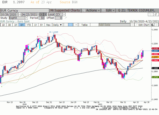Avrupa Merkez Bankası toplantısı geride kaldı sıra geldi bu hafta yapılacak olan FED toplantısına; ECB toplantısından döviz piyasasının beklentisi yüksek değildi. Banka pandemi döneminde ekonomiye destek amaçlı yapılan varlık alımları konusunu irdelemeyi Haziran ayı toplantısına bıraktı. Üyelerin bir kısmı yılın 3. Çeyreğinde muhtemel ekonomik toparlanma ile varlık alımlarını kademeli olarak geri çekilmesi gerektiğini düşünürken üyelerin bir kısmı mevcut aylık 1.85 trilyon dolarlık varlık alımının yılın ikinci yarısında da korunması gerektiğini savunuyor. Sonuç olarak, ECB toplantısının döviz piyasası etkisi beklendiği gibi limitli oldu. Ancak haftanın son işlem gününde Euro Bölgesi PMI imalat sanayi endeksinde 66.4 olarak beklenti üzerinde artış yine servis sektör PMI endeksinin 50.3 olarak iyileşmesi bölgenin para birimine destek oldu. Almanya ve Fransa özelinde PMI imalat sanayi endekslerinde iyileşmenin de pozitif olduğu görülüyor. Nisan ayı ilk okum olan verilerde sonrasında revizyonlar gelecek. Ancak her durumda Nisan ayında imalat sanayi tarafındaki kıpırdanma dikkat çekiyor. Bu hafta FED toplantısını ve ABD ilk çeyrek büyüme rakamını bekelerken Euro/dolar paritesi 1.2000 üzerinde kalabilir ise yükseliş eğilimini koruyacaktır.