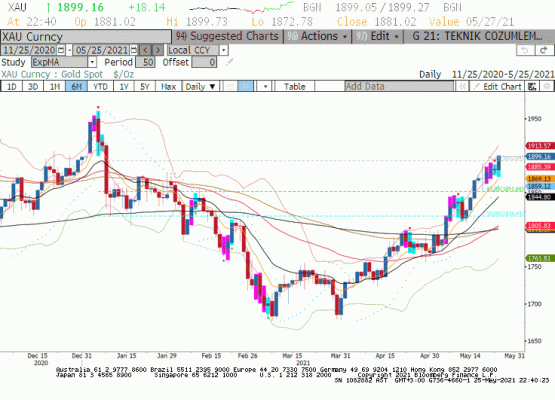 FED üyelerinin açıklamaları ile ABD’de enflasyonun geçici olduğuna ikna olmuş görünen fiyatlamalar ile Dolar Endeksi 89.50 seviyesine doğru geri çekilirken ABD 10 yıllık tahvil faiz oranları %1.56 seviyesine geriledi. Hisse senedi piyasaları yükseliş eğilimini koruyor tahıl ürün grubu aşağı yönlü düzeltme yaparken enerji piyasasında fiyatlar yüksek seviyelerini koruyor. Bu tabloda dünkü seansta altın fiyatlarının 1890 dolar üzerinde geçmesi gayet makul iken yatırımcının küçük adımlar ile piyasayı yukarı taşımak istediğini fark ediyoruz. Kısa vadede 1870 dolar üzerinde kaldığı sürece yükseliş denemeleri yapacağını düşündüğümüz ons altında 1900 üzerinde kapanışlar yeni alıcılara cesaret verebilir.