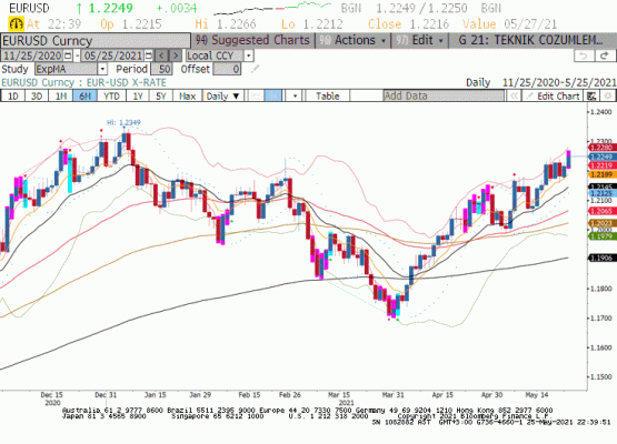 Dolar Endeksi 89.50 seviyesine doğru geri çekilirken Euro/dolar paritesi 1.2250 civarında kapanış yaptı. Dün Avrupa hisse senedi piyasaları teknoloji hisse senetleri ve emlak sektöründen gelen bir satın alma haberi ile güçlü bir performans sergiledi. Öte yanda geçtiğimiz Cuma Mayıs ayı PMI verileri ilk okuma piyasaları memnun ederken dünde Almanya’da iş dünyası güveninin 99.2 (beklenti 98.0) pozitif gerçekleşmesi ile Euro’nun moral bulduğunu söyleyebiliriz. Avrupa ekonomisi ABD’ye kıyasla geriden gelirken yılın üçüncü çeyreğinde ekonomik iyileşmede zirvenin görüleceği tahmin ediliyor. Hindistan mutandı ile beliren endişelerde hızlanan aşılama süreci ile arka plana itildiğine göre küresel risk alma eğiliminin sürdüğü ve Doları 90.00 endeks seviyesi altında kaldığı ortamda Euro 1.2250 üzerinde kalıcılık sağlayabilir.