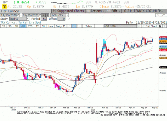 Dolar Endeksi 89.50-90.00 Aralığında zaman harcarken ABD Dolarının ılımlı değer kaybı gelişen ülke para birimleri için pozitif diyebiliriz. Buna rağmen içeride Dolar/TL paritesi dünkü seansta 8.4875 seviyesini görerek 8.4500 üzerinde kapanış yaparak gelişen ülke para birimleri genelindeki iyimserlikten ayrıştı. Son beş işlem gününde Türk Lirası ABD Doları karşısında %1.3 değer kaybetti. Türk Lirası’nın değer kaybına sebep olacak gelişmeler arasında iki Pentagon yetkilisinin F-35 programından çıkarılması ardından üretimde tedarik edilen parçaların alımının da durdurulacağı yönündeki haber akışı etkili oldu. Son dönemde ABD ile ilişkilerde kırılganlık TL ve cinsi varlıklara olumsuz yansıyor. Öte yanda öncesinde belirttiğimiz üzere pandemi sonrasında arz/talep dengesinin bozulması ile emtia fiyatlarında yükseliş içeride enflasyon ile mücadeleyi zorlaştırıyor. Türkiye 2020 senesi pandemi etkilerinde kurulmaya çalışırken büyüme ve enflasyon ile mücadeleyi dengede tutmaya çalışıyor. Gelişen ülkeler öncesinde orta vadeli enflasyon hedeflerinden uzakta iken bu dönemde emtia piyasasında fiyat yükselişleri kısa vadeli de olsa tol ere edilebilir. Ancak öncesinde enflasyon ile mücadele eden ülkeler için zor bir dönemeç diyebiliriz. 8.3000 altında kapanışlar yapamayarak yukarı yönlü eğilimini koruyan Dolar/TL paritesinde günlük grafikte daralan bollinger bant artık karar zamanı imajı veriyordu. Dün artan volatilite ile yaşanan yükseliş yeni yüksek seviyelerin görülebileceğini işaret etti.