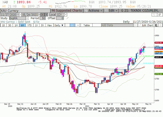 ABD Doları’nın değer kazanımı ve 10 yıllık tahvil faiz oranlarında ılımlı yükseliş ile ons altın fiyatları 1900 dolar/ons üzerinde kalamadı. Günün yüksek seviyesi 1912.76 iken 1890 dolar üzerinde kapanış ile yükseliş denemeleri sürebilir. Geçtiğimiz raporlarda 1890 seviyesini defalarca deneyen altın son iki günde bu seviyeyi geçebilmişti. Bu nedenle kısa vadede 1890 altında kapanışların zayıflık emaresi olduğu söylenebilir. Biraz daha orta vadeli düşünen yatırımcı için ise 1852 önemli destek olarak görülüyor. Son 8 haftanın 7 sinde yükselen ons altın fiyatlarında 1900 dolar algısı önemliydi. Ancak son 7 haftada yaklaşık 160 dolarlık yükseliş yaşandığına göre bugün yaşanan satışlar normal ve önemli olan haftalık kapanışın nasıl olacağı? 16 Haziran FED toplantısının ve varlık alımları ne zaman konuşulacak beklentisinin fiyatlarda yükselişin önüne geçtiği ortamda altında da dalga boyları artabilir.